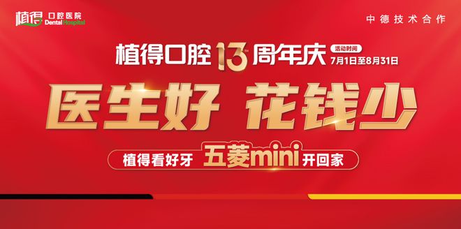 13年筑匠心,研磨毫厘间。这个盛夏,植得口腔医疗集团迎来了13周年庆。13年来,植得口腔坚守初心,积极提高口腔医疗质量,凭借过硬的技术和口碑赢得市民信赖。值此13周年庆典之际,我们不仅邀请您共同见证植得口腔的成长,更准备了中德专家团队会诊、惊喜抽奖赢取五菱MINI、种牙、矫正、儿牙项目补贴等精彩活动。